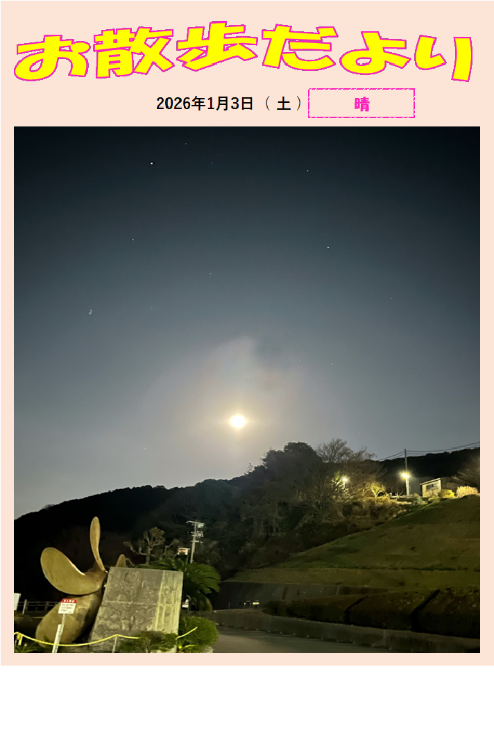 2026.01.06 / 最終更新日時 : 2026.01.06 admin 旅行村通信 お散歩だより(2026.1.3) 今年初めての満月でした。 ウルフムーン(狼月)、かなり大きく見えたのですが 写真でお伝えするのは難しいですね! 天体観測もいいですよ。