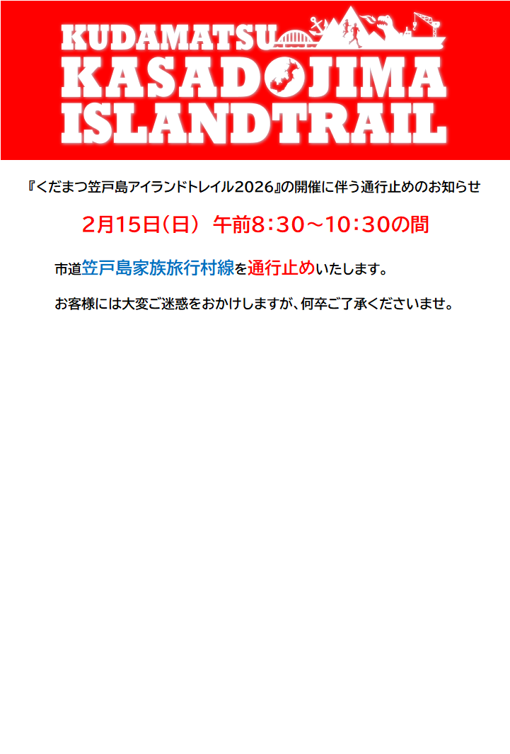 【重要】『くだまつ笠戸島アイランドトレイル2026』開催に伴う一時通行止めのお知らせ